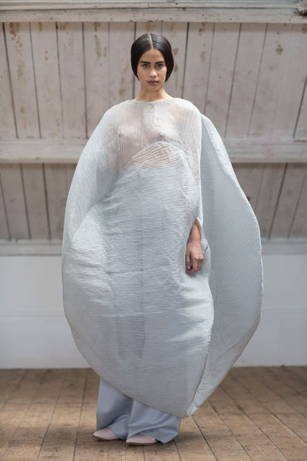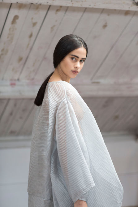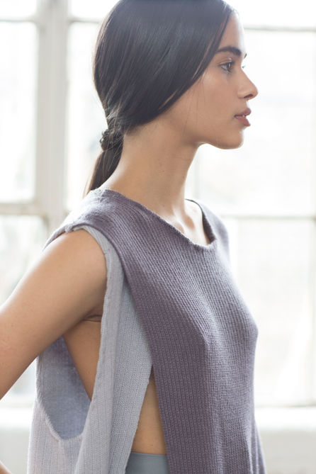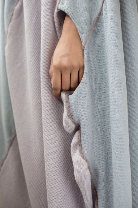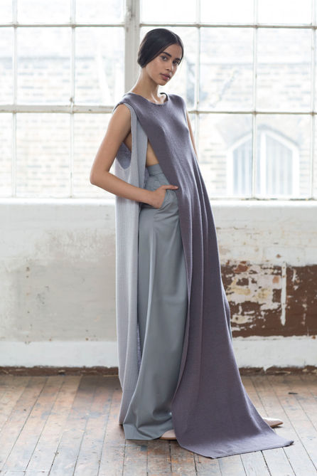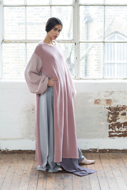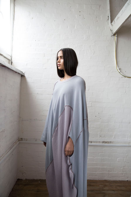 ‘My fundamental inspiration for my collection ‘Skin on Skin’ comes from a fascination with dusty colours and feel: layered designs with muted shades of lavender and pale blues in soft knitted and woven fabrics complement the feminine body.